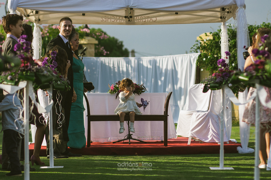 En esta ocasión comenzamos en la cafetería del hotel Asta Regia, un precioso y moderno edificio en el centro de Jerez. Allí compartimos los inicios del día con la pareja y gran parte de los invitados. Entre las mesas, corrían sin descanso las pequeñas Carla y Jimena acompañadas en todo momento por Blancanieves y Nenuco, gritos, besos y carreras entre los que logramos captar unos bonitos instantes mientras que los demás iniciaban el día con una café.