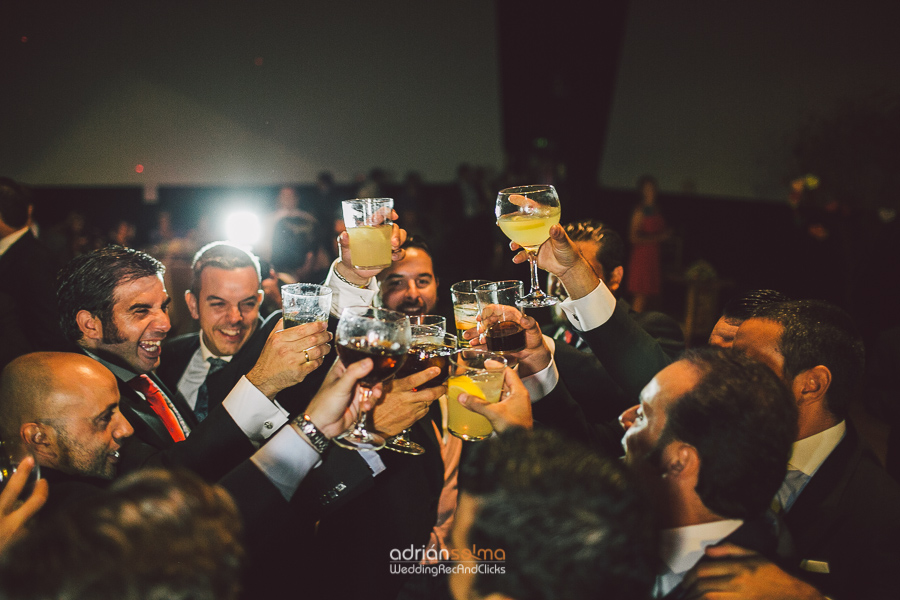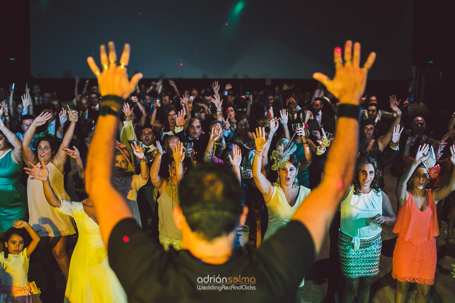 Los tiempos se cumplían y tras un fugaz almuerzo, llegamos al baile. En el ambiente se notaba, la gente quería fiesta, venían con ganas de pasarlo bien. Un photocall, barra libre de Pepe Limón y un «candy bar» de más de cinco metros montado por Manuel Sanchez, todo ello bajo las luces y la música del gran Tony. Pero ahí no quedó todo, los novios pusieron toda la carne en el asador en este tramo final de la boda. En un primer lugar el grupo «A Contratiempo», que dejó el salón lleno de rumbas y versiones, para más tarde, acabar con un sorpresón de Miguel a Elena, desde el patio de los museos de la Atalaya se escuchaban surdos, cajas y tamborines, la batukada «Percufusión» irrumpió en el salón y nos trajo una hora de ritmos y animaciones que elevaron la fiesta al máximo exponente.